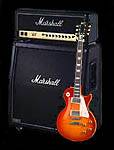 beautiful flame top Gibson Les Paul and also uses Marshall Amps.
